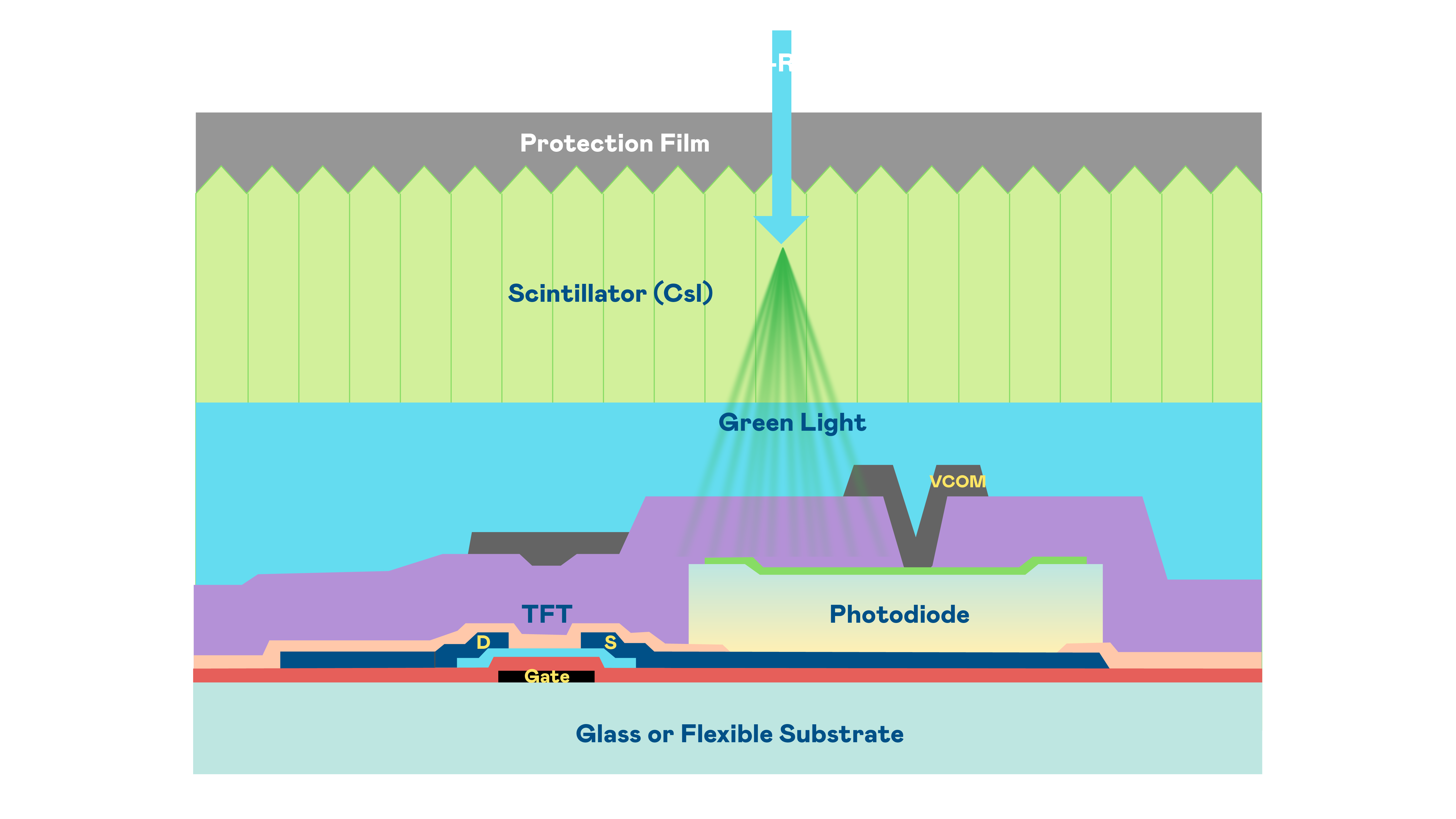 EBpay的X光影像感测阵列使用薄膜电晶体 (TFT) 作为每个像素的读取开关,搭配光电二极体(Photodiode)的光电转换元件,用以感测X光影像讯号。